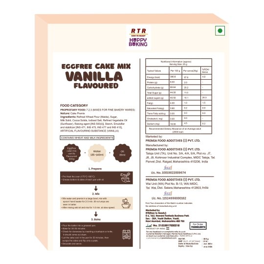 About this item 🰠Rich Vanilla Flavour - Classic vanilla essence for a naturally aromatic and delicious cake 🧠Soft & Fluffy Texture - Bakes into a light, airy sponge perfect for celebrations or daily treats 🥚 Eggless & Vegetarian - 100% egg-free, suitable for all ages and dietary needs â±ï¸ Quick & Easy to Bake - Just add water, mix, and bake - ready in minutes 🎉 Perfect for All Occasions - Ideal for birthdays, parties, tea-time, and festive baking 🥠Versatile Mix - Great for cupcakes, layered cakes, or loaf-style bakes 📦 300g Convenient Pack - Makes one medium-sized cake or 6-8 cupcakes ✅ No Artificial Preservatives - Made with clean, high-quality ingredients