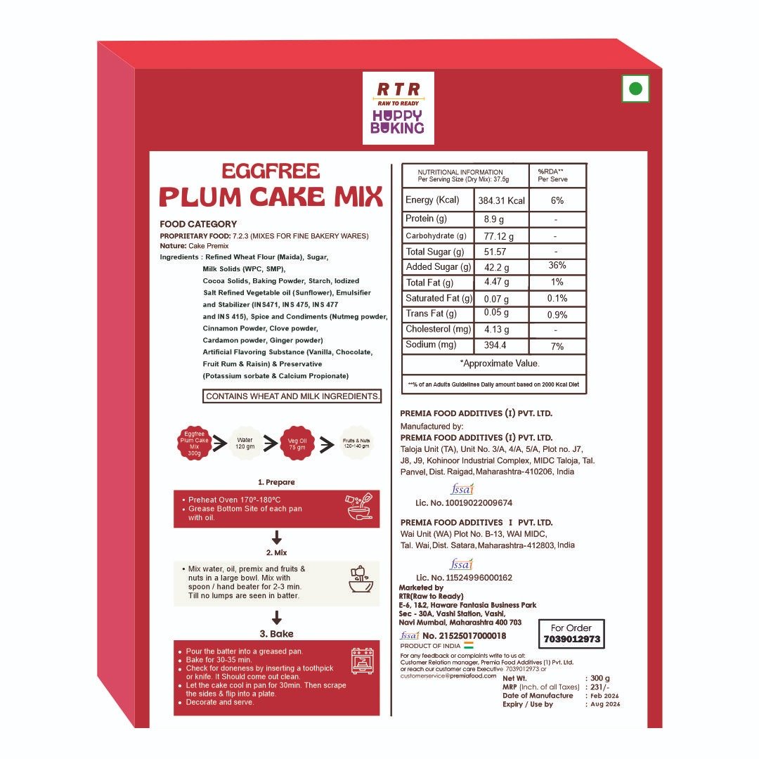 About this item ???? PLUM CAKE MIX PLUM CAKE MIX – Enjoy deliciously soft and fragrant muffins with every bite ???? Eggless & Vegetarian – 100% egg-free mix, suitable for all age groups and preferences ⏱️ Quick & Easy to Bake – Just add water or milk, mix, and bake for instant homemade treats ???? Perfect for Every Occasion – Great for kids’ lunchboxes, birthdays, festive baking, and gifting ???? Bakery-Style Texture – Yields fluffy, moist muffins with a light crumb ???? 300g Convenient Pack – Makes approx. 6–8 medium-sized muffins or cupcakes ✅ No Artificial Preservatives – Made with high-quality, clean ingredients you can trust ????️ Versatile Use – Ideal for muffins, cupcakes, mini loafs, or dessert bases